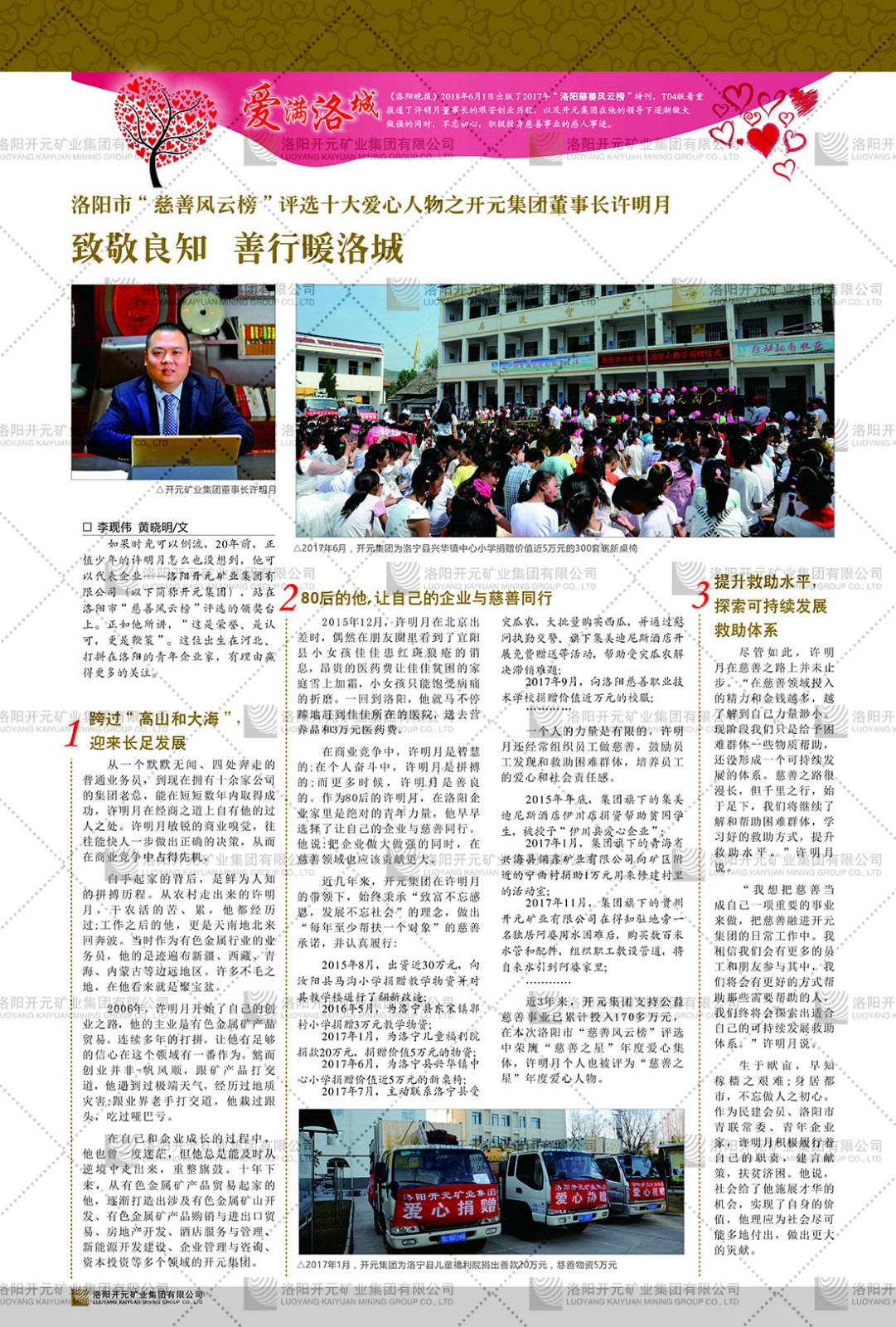 洛陽(yáng)開(kāi)元礦業(yè)集團(tuán)有限公司簡(jiǎn)介洛陽(yáng)開(kāi)元礦業(yè)集團(tuán)有限公司,始成立于2006年,位于洛陽(yáng)市開(kāi)元大道269號(hào)。集團(tuán)旗下共有五余家全資子公司,業(yè)務(wù)涉及有色金屬礦山開(kāi)發(fā)、礦產(chǎn)品購(gòu)銷(xiāo)與進(jìn)出口貿(mào)易、房地產(chǎn)開(kāi)發(fā)、文化藝術(shù)、企業(yè)管理與咨詢(xún)、資本投資等多個(gè)領(lǐng)域。民建河南省委委員、民建河南省委企業(yè)委副主任、民建洛陽(yáng)市委委員、企業(yè)委主任、洛陽(yáng)民建企業(yè)家協(xié)會(huì)會(huì)長(zhǎng)許明月是公司創(chuàng)始人,現(xiàn)任洛陽(yáng)開(kāi)元礦業(yè)集團(tuán)有限公司董事長(zhǎng)。在礦業(yè)領(lǐng)域,洛陽(yáng)開(kāi)元礦業(yè)集團(tuán)擁有多家實(shí)力雄厚的子公司:貴州開(kāi)元礦業(yè)有限公司探、采礦權(quán)面積共11.33平方公里;興海縣銅鑫礦業(yè)有限公司探礦權(quán)面積8.76平方公里,礦山資源潛力巨大;2021年,開(kāi)元集團(tuán)與盧氏中科礦業(yè)有限公司開(kāi)展戰(zhàn)略合作。盧氏中科礦業(yè)有限公司專(zhuān)注于有色金屬的浮選、加工和銷(xiāo)售,擁有強(qiáng)大的技術(shù)支撐平臺(tái),是集探、采、選、冶、研為一體的中大型綜合礦業(yè)企業(yè)。目前,盧氏中科王家河1000噸選礦廠已成功投產(chǎn),雙河金礦、柳關(guān)欒盧鉛鋅礦相繼順利開(kāi)工,樓房銀礦與圪老灣鉛鋅礦的深部探礦重大突破,標(biāo)志著礦山版圖取得重大進(jìn)展,為開(kāi)元集團(tuán)后續(xù)發(fā)展奠定了堅(jiān)實(shí)基礎(chǔ)。在文化傳媒領(lǐng)域,洛陽(yáng)市明月美術(shù)館通過(guò)豐富多樣的藝術(shù)展覽、學(xué)術(shù)研討和公共教育活動(dòng),努力打造一個(gè)集展覽、交流、教育、研究為一體的綜合性藝術(shù)平臺(tái)。此外,在金融投資領(lǐng)域,開(kāi)元集團(tuán)旗下的北京明峰資本管理有限公司專(zhuān)注于投資具有高增長(zhǎng)潛力的優(yōu)秀企業(yè),特別是高科技、新能源、環(huán)保等新興產(chǎn)業(yè),為客戶(hù)提供個(gè)性化的資產(chǎn)配置服務(wù)。在做好企業(yè)經(jīng)營(yíng)的同時(shí),開(kāi)元集團(tuán)始終不忘企業(yè)的社會(huì)責(zé)任和家國(guó)情懷,以突出的愛(ài)心公益事跡,開(kāi)展了一系列公益慈善活動(dòng):“民建林”公益事業(yè)通過(guò)“思源基金”“幫幫公益”線上公益平臺(tái),與眾多愛(ài)心人士籌措資金20余萬(wàn)元;資助541名貧困大學(xué)生共計(jì)270余萬(wàn)元,推進(jìn)“數(shù)字助力——河南AI人才培養(yǎng)”;捐款10萬(wàn)元,馳援京津冀、黑龍江洪水地質(zhì)災(zāi)害……公司于2017年底被洛陽(yáng)市慈善總會(huì)評(píng)為“洛陽(yáng)慈善風(fēng)云榜——十大愛(ài)心集體”。洛陽(yáng)開(kāi)元礦業(yè)集團(tuán)有限公司秉承持續(xù)發(fā)展理念,憑借多年來(lái)良好的企業(yè)信譽(yù)與經(jīng)營(yíng)業(yè)績(jī),與全國(guó)多家企業(yè)建立了良好合作關(guān)系,受到社會(huì)各界的一致好評(píng),多次榮獲“納稅標(biāo)兵”“先進(jìn)企業(yè)”“招商引資模范企業(yè)”等榮譽(yù)稱(chēng)號(hào)。回望來(lái)時(shí)路,開(kāi)元人勠力同心,以“闖”的精神和“創(chuàng)”的勁頭,一路披荊斬棘,踏過(guò)千山萬(wàn)水;展望新未來(lái),開(kāi)元人凝心聚力,不執(zhí)于“舊”,無(wú)畏于“新”,秉承“勇于跨越,追求卓越”的企業(yè)精神,乘著國(guó)家高質(zhì)量發(fā)展新征程的東風(fēng),跨過(guò)高山,越過(guò)大海,向著集團(tuán)多元化、國(guó)際化的目標(biāo),逐夢(mèng)遠(yuǎn)航,跨越前行!