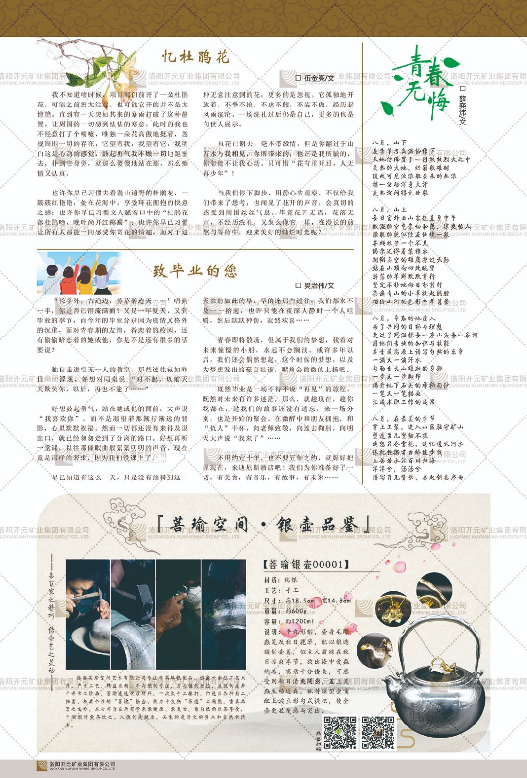 洛陽開元礦業(yè)集團(tuán)有限公司簡介洛陽開元礦業(yè)集團(tuán)有限公司,始成立于2006年,位于洛陽市開元大道269號。集團(tuán)旗下共有五余家全資子公司,業(yè)務(wù)涉及有色金屬礦山開發(fā)、礦產(chǎn)品購銷與進(jìn)出口貿(mào)易、房地產(chǎn)開發(fā)、文化藝術(shù)、企業(yè)管理與咨詢、資本投資等多個領(lǐng)域。民建河南省委委員、民建河南省委企業(yè)委副主任、民建洛陽市委委員、企業(yè)委主任、洛陽民建企業(yè)家協(xié)會會長許明月是公司創(chuàng)始人,現(xiàn)任洛陽開元礦業(yè)集團(tuán)有限公司董事長。在礦業(yè)領(lǐng)域,洛陽開元礦業(yè)集團(tuán)擁有多家實(shí)力雄厚的子公司:貴州開元礦業(yè)有限公司探、采礦權(quán)面積共11.33平方公里;興海縣銅鑫礦業(yè)有限公司探礦權(quán)面積8.76平方公里,礦山資源潛力巨大;2021年,開元集團(tuán)與盧氏中科礦業(yè)有限公司開展戰(zhàn)略合作。盧氏中科礦業(yè)有限公司專注于有色金屬的浮選、加工和銷售,擁有強(qiáng)大的技術(shù)支撐平臺,是集探、采、選、冶、研為一體的中大型綜合礦業(yè)企業(yè)。目前,盧氏中科王家河1000噸選礦廠已成功投產(chǎn),雙河金礦、柳關(guān)欒盧鉛鋅礦相繼順利開工,樓房銀礦與圪老灣鉛鋅礦的深部探礦重大突破,標(biāo)志著礦山版圖取得重大進(jìn)展,為開元集團(tuán)后續(xù)發(fā)展奠定了堅實(shí)基礎(chǔ)。在文化傳媒領(lǐng)域,洛陽市明月美術(shù)館通過豐富多樣的藝術(shù)展覽、學(xué)術(shù)研討和公共教育活動,努力打造一個集展覽、交流、教育、研究為一體的綜合性藝術(shù)平臺。此外,在金融投資領(lǐng)域,開元集團(tuán)旗下的北京明峰資本管理有限公司專注于投資具有高增長潛力的優(yōu)秀企業(yè),特別是高科技、新能源、環(huán)保等新興產(chǎn)業(yè),為客戶提供個性化的資產(chǎn)配置服務(wù)。在做好企業(yè)經(jīng)營的同時,開元集團(tuán)始終不忘企業(yè)的社會責(zé)任和家國情懷,以突出的愛心公益事跡,開展了一系列公益慈善活動:“民建林”公益事業(yè)通過“思源基金”“幫幫公益”線上公益平臺,與眾多愛心人士籌措資金20余萬元;資助541名貧困大學(xué)生共計270余萬元,推進(jìn)“數(shù)字助力——河南AI人才培養(yǎng)”;捐款10萬元,馳援京津冀、黑龍江洪水地質(zhì)災(zāi)害……公司于2017年底被洛陽市慈善總會評為“洛陽慈善風(fēng)云榜——十大愛心集體”。洛陽開元礦業(yè)集團(tuán)有限公司秉承持續(xù)發(fā)展理念,憑借多年來良好的企業(yè)信譽(yù)與經(jīng)營業(yè)績,與全國多家企業(yè)建立了良好合作關(guān)系,受到社會各界的一致好評,多次榮獲“納稅標(biāo)兵”“先進(jìn)企業(yè)”“招商引資模范企業(yè)”等榮譽(yù)稱號。回望來時路,開元人勠力同心,以“闖”的精神和“創(chuàng)”的勁頭,一路披荊斬棘,踏過千山萬水;展望新未來,開元人凝心聚力,不執(zhí)于“舊”,無畏于“新”,秉承“勇于跨越,追求卓越”的企業(yè)精神,乘著國家高質(zhì)量發(fā)展新征程的東風(fēng),跨過高山,越過大海,向著集團(tuán)多元化、國際化的目標(biāo),逐夢遠(yuǎn)航,跨越前行!