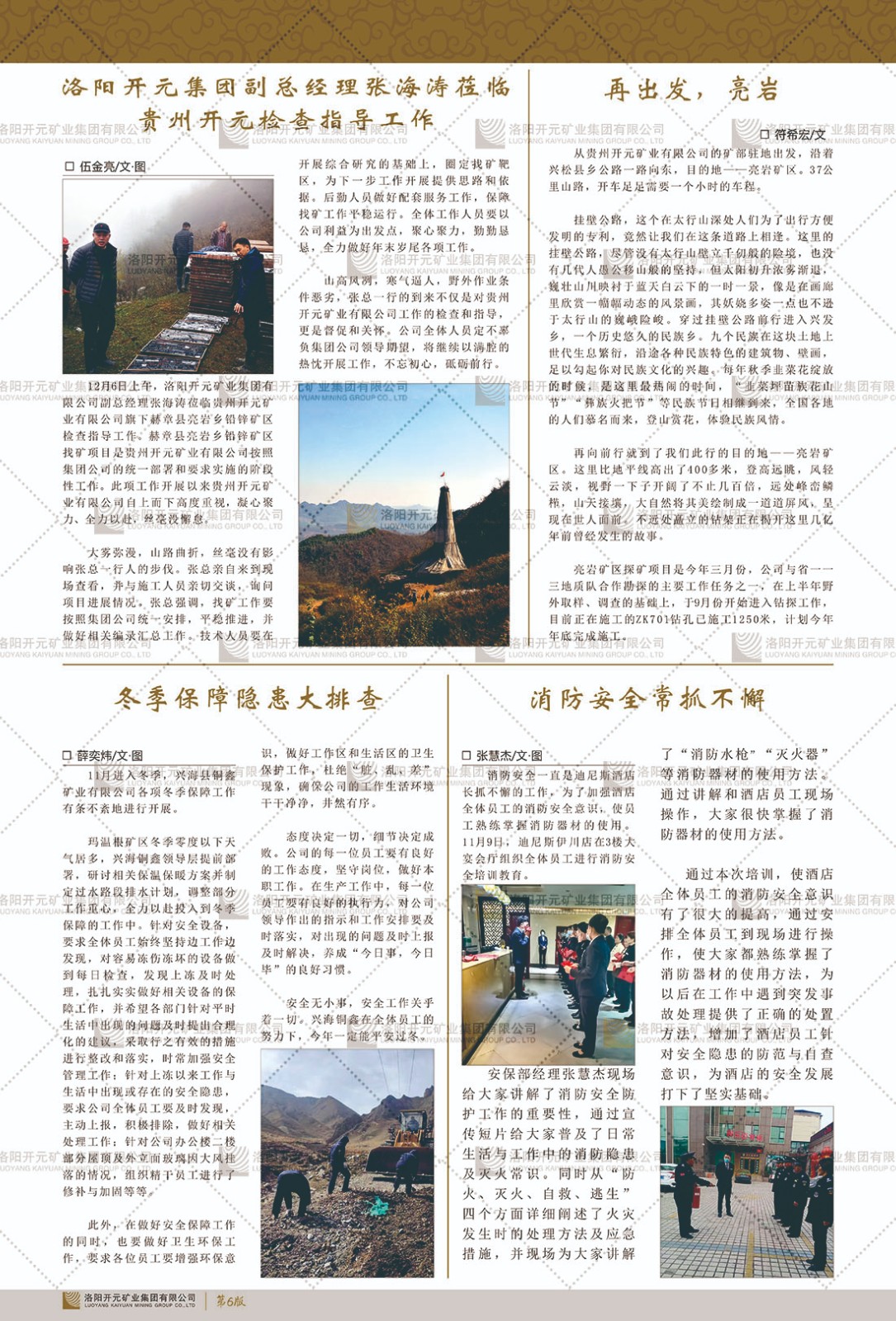 洛陽開元礦業(yè)集團有限公司簡介洛陽開元礦業(yè)集團有限公司,始成立于2006年,位于洛陽市開元大道269號。集團旗下共有五余家全資子公司,業(yè)務涉及有色金屬礦山開發(fā)、礦產(chǎn)品購銷與進出口貿(mào)易、房地產(chǎn)開發(fā)、文化藝術、企業(yè)管理與咨詢、資本投資等多個領域。民建河南省委委員、民建河南省委企業(yè)委副主任、民建洛陽市委委員、企業(yè)委主任、洛陽民建企業(yè)家協(xié)會會長許明月是公司創(chuàng)始人,現(xiàn)任洛陽開元礦業(yè)集團有限公司董事長。在礦業(yè)領域,洛陽開元礦業(yè)集團擁有多家實力雄厚的子公司:貴州開元礦業(yè)有限公司探、采礦權面積共11.33平方公里;興海縣銅鑫礦業(yè)有限公司探礦權面積8.76平方公里,礦山資源潛力巨大;2021年,開元集團與盧氏中科礦業(yè)有限公司開展戰(zhàn)略合作。盧氏中科礦業(yè)有限公司專注于有色金屬的浮選、加工和銷售,擁有強大的技術支撐平臺,是集探、采、選、冶、研為一體的中大型綜合礦業(yè)企業(yè)。目前,盧氏中科王家河1000噸選礦廠已成功投產(chǎn),雙河金礦、柳關欒盧鉛鋅礦相繼順利開工,樓房銀礦與圪老灣鉛鋅礦的深部探礦重大突破,標志著礦山版圖取得重大進展,為開元集團后續(xù)發(fā)展奠定了堅實基礎。在文化傳媒領域,洛陽市明月美術館通過豐富多樣的藝術展覽、學術研討和公共教育活動,努力打造一個集展覽、交流、教育、研究為一體的綜合性藝術平臺。此外,在金融投資領域,開元集團旗下的北京明峰資本管理有限公司專注于投資具有高增長潛力的優(yōu)秀企業(yè),特別是高科技、新能源、環(huán)保等新興產(chǎn)業(yè),為客戶提供個性化的資產(chǎn)配置服務。在做好企業(yè)經(jīng)營的同時,開元集團始終不忘企業(yè)的社會責任和家國情懷,以突出的愛心公益事跡,開展了一系列公益慈善活動:“民建林”公益事業(yè)通過“思源基金”“幫幫公益”線上公益平臺,與眾多愛心人士籌措資金20余萬元;資助541名貧困大學生共計270余萬元,推進“數(shù)字助力——河南AI人才培養(yǎng)”;捐款10萬元,馳援京津冀、黑龍江洪水地質災害……公司于2017年底被洛陽市慈善總會評為“洛陽慈善風云榜——十大愛心集體”。洛陽開元礦業(yè)集團有限公司秉承持續(xù)發(fā)展理念,憑借多年來良好的企業(yè)信譽與經(jīng)營業(yè)績,與全國多家企業(yè)建立了良好合作關系,受到社會各界的一致好評,多次榮獲“納稅標兵”“先進企業(yè)”“招商引資模范企業(yè)”等榮譽稱號。回望來時路,開元人勠力同心,以“闖”的精神和“創(chuàng)”的勁頭,一路披荊斬棘,踏過千山萬水;展望新未來,開元人凝心聚力,不執(zhí)于“舊”,無畏于“新”,秉承“勇于跨越,追求卓越”的企業(yè)精神,乘著國家高質量發(fā)展新征程的東風,跨過高山,越過大海,向著集團多元化、國際化的目標,逐夢遠航,跨越前行!