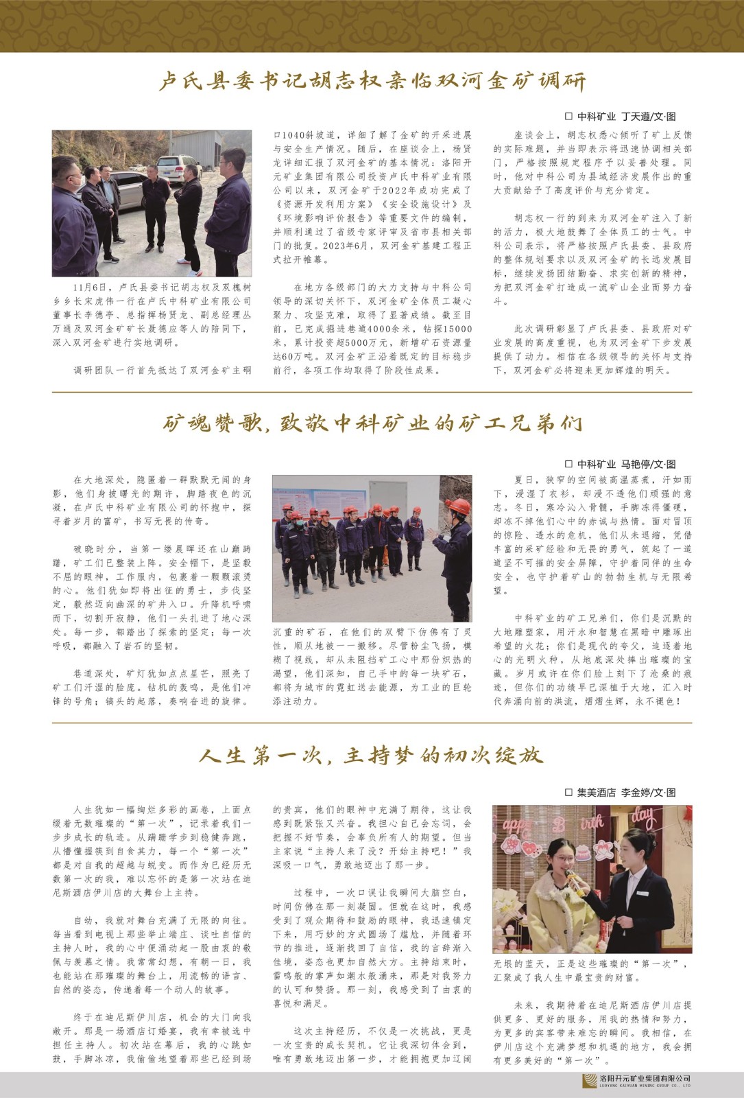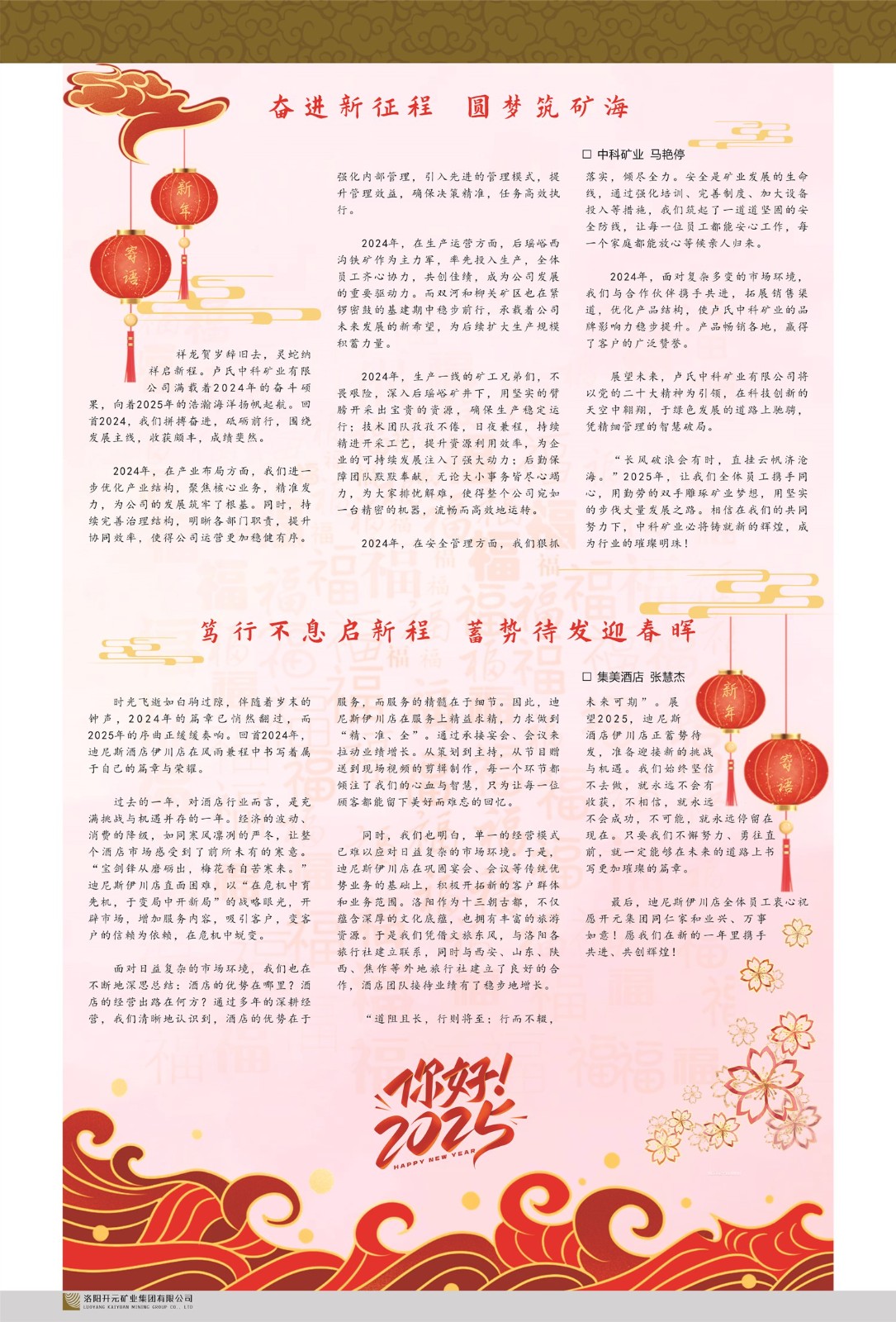 洛陽開元礦業(yè)集團(tuán)有限公司簡介洛陽開元礦業(yè)集團(tuán)有限公司,始成立于2006年,位于洛陽市開元大道269號。集團(tuán)旗下共有五余家全資子公司,業(yè)務(wù)涉及有色金屬礦山開發(fā)、礦產(chǎn)品購銷與進(jìn)出口貿(mào)易、房地產(chǎn)開發(fā)、文化藝術(shù)、企業(yè)管理與咨詢、資本投資等多個領(lǐng)域。民建河南省委委員、民建河南省委企業(yè)委副主任、民建洛陽市委委員、企業(yè)委主任、洛陽民建企業(yè)家協(xié)會會長許明月是公司創(chuàng)始人,現(xiàn)任洛陽開元礦業(yè)集團(tuán)有限公司董事長。在礦業(yè)領(lǐng)域,洛陽開元礦業(yè)集團(tuán)擁有多家實(shí)力雄厚的子公司:貴州開元礦業(yè)有限公司探、采礦權(quán)面積共11.33平方公里;興海縣銅鑫礦業(yè)有限公司探礦權(quán)面積8.76平方公里,礦山資源潛力巨大;2021年,開元集團(tuán)與盧氏中科礦業(yè)有限公司開展戰(zhàn)略合作。盧氏中科礦業(yè)有限公司專注于有色金屬的浮選、加工和銷售,擁有強(qiáng)大的技術(shù)支撐平臺,是集探、采、選、冶、研為一體的中大型綜合礦業(yè)企業(yè)。目前,盧氏中科王家河1000噸選礦廠已成功投產(chǎn),雙河金礦、柳關(guān)欒盧鉛鋅礦相繼順利開工,樓房銀礦與圪老灣鉛鋅礦的深部探礦重大突破,標(biāo)志著礦山版圖取得重大進(jìn)展,為開元集團(tuán)后續(xù)發(fā)展奠定了堅(jiān)實(shí)基礎(chǔ)。在文化傳媒領(lǐng)域,洛陽市明月美術(shù)館通過豐富多樣的藝術(shù)展覽、學(xué)術(shù)研討和公共教育活動,努力打造一個集展覽、交流、教育、研究為一體的綜合性藝術(shù)平臺。此外,在金融投資領(lǐng)域,開元集團(tuán)旗下的北京明峰資本管理有限公司專注于投資具有高增長潛力的優(yōu)秀企業(yè),特別是高科技、新能源、環(huán)保等新興產(chǎn)業(yè),為客戶提供個性化的資產(chǎn)配置服務(wù)。在做好企業(yè)經(jīng)營的同時,開元集團(tuán)始終不忘企業(yè)的社會責(zé)任和家國情懷,以突出的愛心公益事跡,開展了一系列公益慈善活動:“民建林”公益事業(yè)通過“思源基金”“幫幫公益”線上公益平臺,與眾多愛心人士籌措資金20余萬元;資助541名貧困大學(xué)生共計(jì)270余萬元,推進(jìn)“數(shù)字助力——河南AI人才培養(yǎng)”;捐款10萬元,馳援京津冀、黑龍江洪水地質(zhì)災(zāi)害……公司于2017年底被洛陽市慈善總會評為“洛陽慈善風(fēng)云榜——十大愛心集體”。洛陽開元礦業(yè)集團(tuán)有限公司秉承持續(xù)發(fā)展理念,憑借多年來良好的企業(yè)信譽(yù)與經(jīng)營業(yè)績,與全國多家企業(yè)建立了良好合作關(guān)系,受到社會各界的一致好評,多次榮獲“納稅標(biāo)兵”“先進(jìn)企業(yè)”“招商引資模范企業(yè)”等榮譽(yù)稱號。回望來時路,開元人勠力同心,以“闖”的精神和“創(chuàng)”的勁頭,一路披荊斬棘,踏過千山萬水;展望新未來,開元人凝心聚力,不執(zhí)于“舊”,無畏于“新”,秉承“勇于跨越,追求卓越”的企業(yè)精神,乘著國家高質(zhì)量發(fā)展新征程的東風(fēng),跨過高山,越過大海,向著集團(tuán)多元化、國際化的目標(biāo),逐夢遠(yuǎn)航,跨越前行!